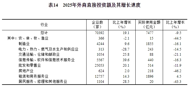 全年新设立外商投资企业70392家,比上年增长19.1%。实际使用外资金额7477亿元,下降9.5%。其中,共建“一带一路”国家(含通过部分自由港对华投资)对华新设立外商投资企业19756家,增长14.7%;对华直接投资1168亿元,增长1.9%。高技术产业实际使用外资2418亿元,下降15.6%。