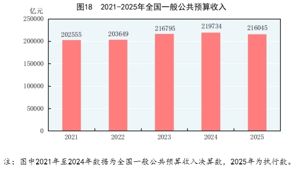 全年全国一般公共预算收入216045亿元,比上年下降1.7%;其中税收收入176363亿元,增长0.8%。全国一般公共预算支出287395亿元,比上年增长1.0%。全年现行支持科技创新和制造业发展的主要政策减税降费及退税金额28557亿元。