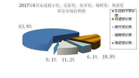 6月份,乐透数字型彩票销售216.28亿元,同比增加19.79亿元,增长10.1%;竞猜型彩票销售63.46亿元,同比减少20.86亿元,下降24.7%;即开型彩票销售20.70亿元,同比减少2.18亿元,下降9.5%;视频型彩票销售37.82亿元,同比增加2.10亿元,增长5.9%;基诺型彩票[1]销售0.17亿元,同比减少0.03亿元,下降16.6%。6月份,乐透数字型、竞猜型、即开型、视频型、基诺型彩票销售量分别占彩票销售总量的63.8%、18.8%、6.1%、11.2%、0.1%。
