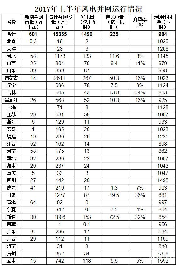 2017年上半年,全国风电新增并网容量601万千瓦,继续保持稳步增长势头,到6月底累计并网容量达到1.54亿千瓦,同比增长12%;上半年,全国风电发电量1490亿千瓦时,同比增长21%;平均利用小时数984小时,同比增加67小时;风电弃风电量235亿千瓦时,同比减少91亿千瓦时,弃风限电形势明显好转。