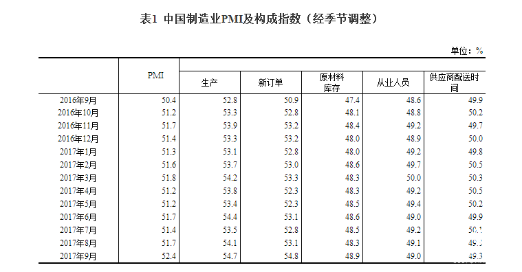 中国产业经济信息网讯 2017年9月份,中国制造业采购经理指数(PMI)为52.4%,比上月上升0.7个百分点,制造业继续保持稳中向好的发展态势,扩张步伐有所加快。
