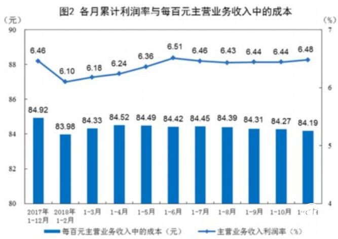 1-11月份,规模以上工业企业实现主营业务收入94.4万亿元,同比增长9.1%;发生主营业务成本79.5万亿元,增长8.8%;主营业务收入利润率为6.48%,同比提高0.16个百分点。