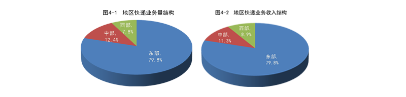 1-4月份,东、中、西部地区快递业务量比重分别为79.8%、12.4%和7.8%,业务收入比重分别为79.8%、11.3%和8.9%。与去年同期相比,东部地区快递业务量比重持平,快递业务收入比重下降0.5个百分点;中部地区快递业务量比重下降0.3个百分点,快递业务收入比重上升0.2个百分点;西部地区快递业务量比重上升0.3个百分点,快递业务收入比重上升0.3个百分点。
