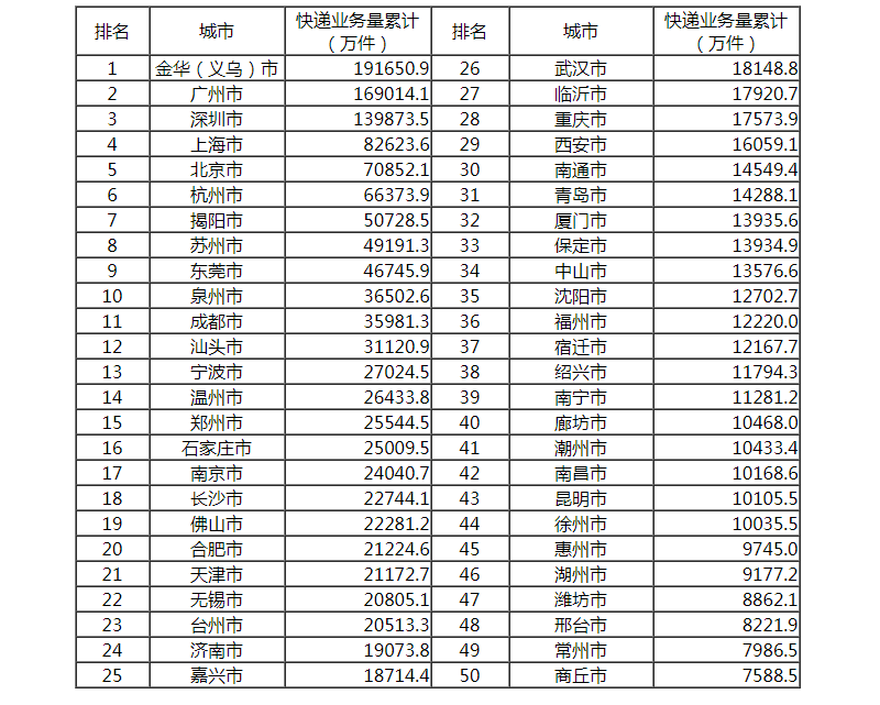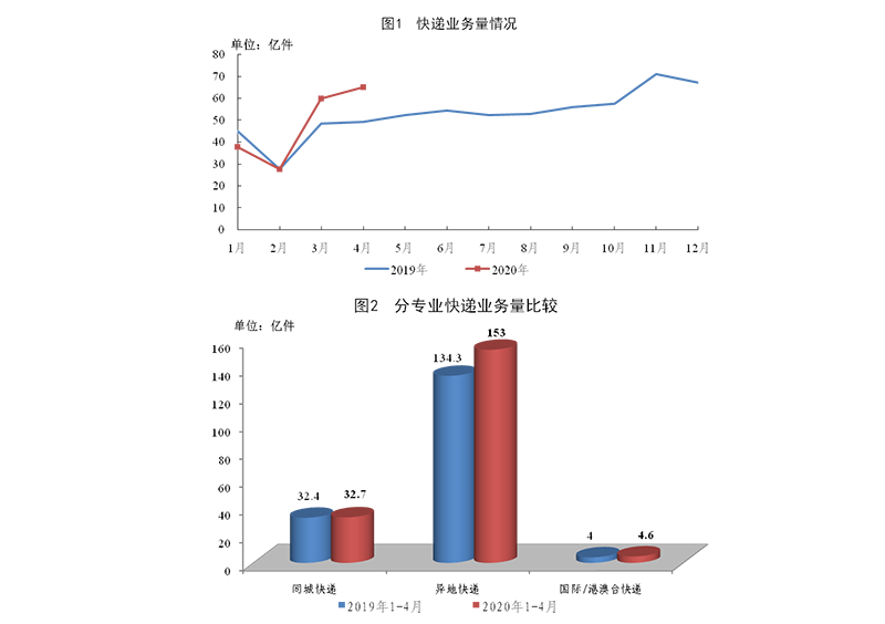 1-4月份,全国快递服务企业业务量累计完成190.3亿件,同比增长11.5%;业务收入累计完成2254.9亿元,同比增长5.6%。其中,同城业务量累计完成32.7亿件,同比增长1%;异地业务量累计完成153亿件,同比增长13.9%;国际/港澳台业务量累计完成4.6亿件,同比增长15.1%。