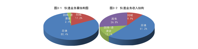 1-4月份,同城、异地、国际/港澳台快递业务量分别占全部快递业务量的17.2%、80.4%和2.4%;业务收入分别占全部快递收入的9.9%、51.2%和12.1%。与去年同期相比,同城快递业务量的比重下降1.8个百分点,异地快递业务量的比重上升1.7个百分点,国际/港澳台业务量的比重上升0.1个百分点。