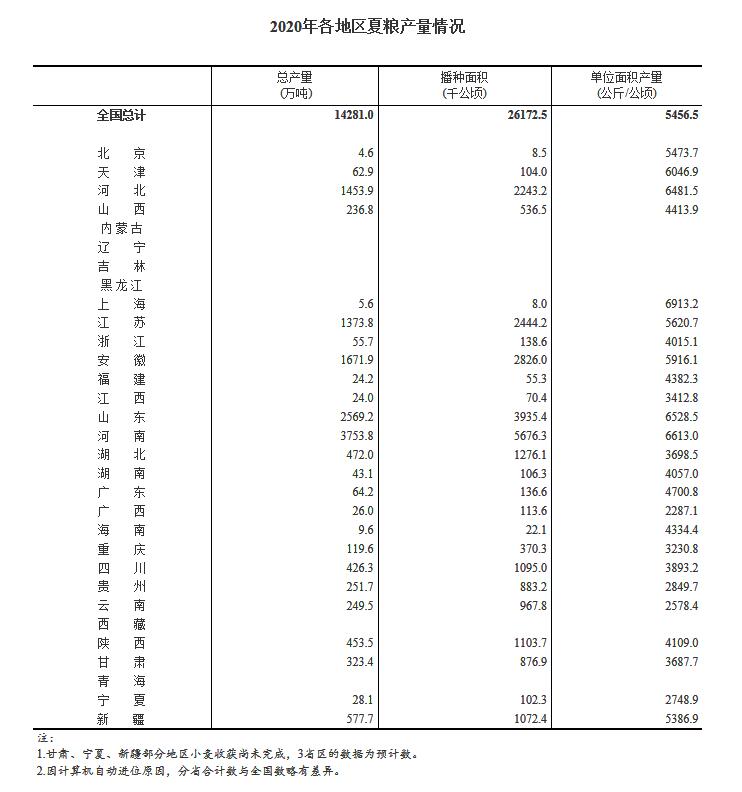 甘肃、宁夏、新疆部分地区由于春小麦成熟较晚,目前夏粮数据为初步预计数。