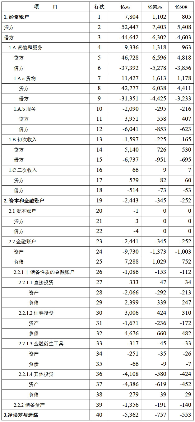 1.根据《国际收支和国际投资头寸手册》(第六版)编制,资本和金融账户中包含储备资产。