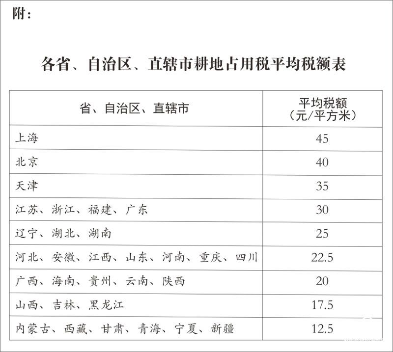 各地区耕地占用税的适用税额,由省、自治区、直辖市人民政府根据人均耕地面积和经济发展等情况,在前款规定的税额幅度内提出,报同级人民代表大会常务委员会决定,并报全国人民代表大会常务委员会和国务院备案。各省、自治区、直辖市耕地占用税适用税额的平均水平,不得低于本法所附《各省、自治区、直辖市耕地占用税平均税额表》规定的平均税额。