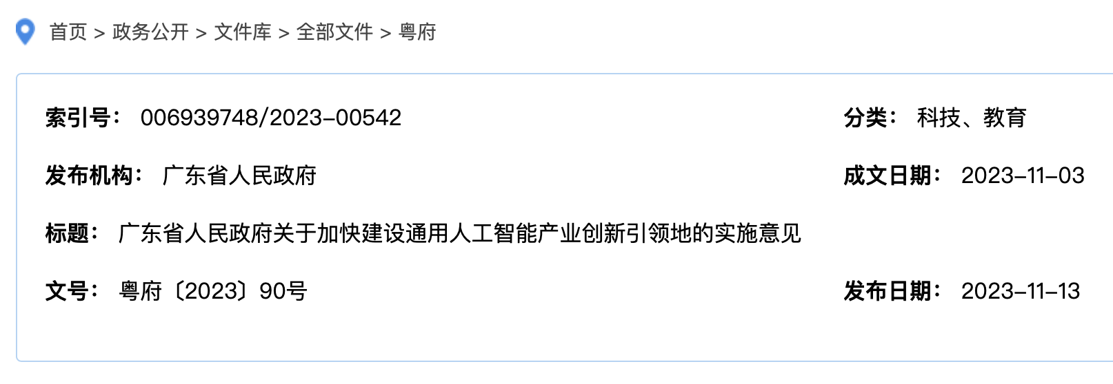 11月13日,广东省人民政府发布了加快建设通用人工智能产业创新引领地的实施意见。