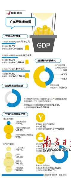 与全国平均水平相比,广东GDP同比增速高于全国,提高幅度快于全国,且增幅优势扩大。上半年,广东GDP同比增速比全国高0.9个百分点,提高幅度比全国快0.2个百分点,增幅差距扩大0.2个百分点。