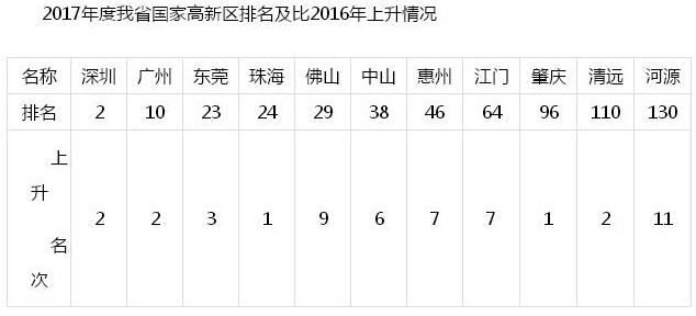 继广东区域创新能力综合排名去年跃居全国首位之后,广东省在不久前科技部火炬中心通报的2017年度国家高新区评价中再创佳绩。记者24日从广东省科技厅获悉,广东省原有的11个国家高新区排名全部实现提升,深圳高新区跃居全国第二,广州高新区进入全国前十。新增汕头、湛江、茂名3家国家级高新区,目前广东省国家级高新区已达到14家。