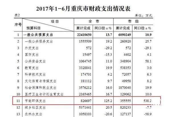 7月18日,重庆市财政局公布了“2017年1—6月重庆市财政预算执行情况”,21世纪经济报道记者发现,上半年重庆财政支出项目中,环保节能的支出出现了大幅增长——按照重庆全市的统计口径,上半年环保节能支出费用为82.67亿元,增速为125.2%;而若按照重庆市级统计口径计算,上半年环保节能支出费用为35.56亿元,增速高达538.2%。