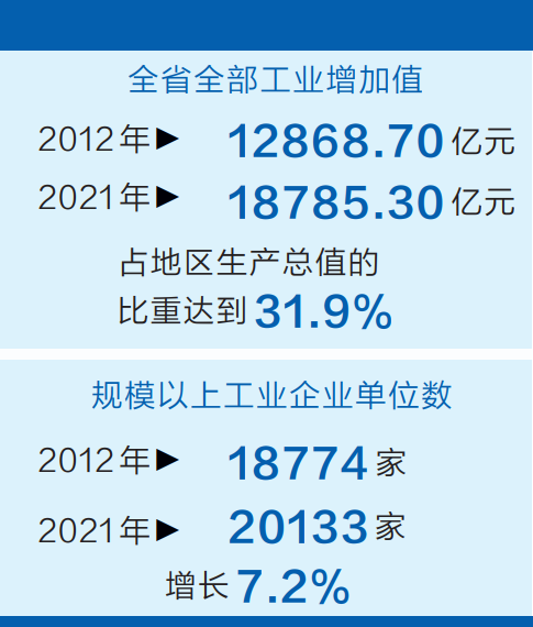 河南省工业经济规模实力在不断壮大。2021年,全省全部工业增加值由2012年的12868.70亿元攀升至18785.30亿元,占地区生产总值的比重达到31.9%;规模以上工业企业单位数由2012年的18774家增加至20133家、增长7.2%,资产总计达到54479.46亿元,实现营业收入54006.42亿元,实现利润2581.17亿元。截至2021年年底,河南规模以上工业资产总量居全国第9位,营业收入居全国第6位。同时,产业体系也更趋完备。目前我省已拥有40个工业大类、197个行业中类、583个行业小类,产业链、供应链韧性和竞争力持续提升。