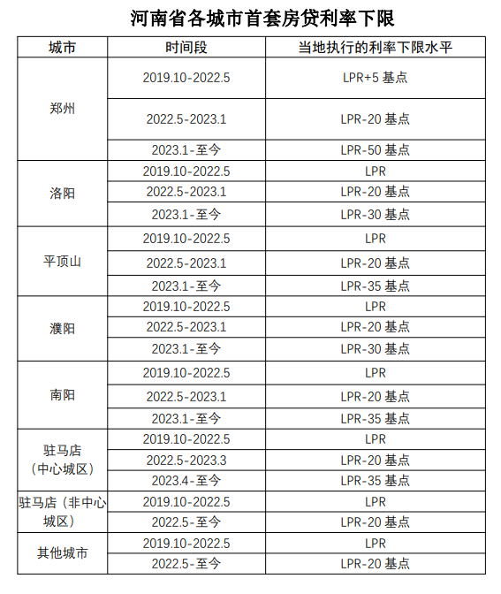 为确保存量房贷利率调整顺利落地,人民银行河南省分行向社会公众公布改革完善贷款市场报价利率(LPR) (2019年10 月(含))以来河南省各城市首套房贷利率下限(见下表),同时提供了相应阶段全国首套房贷利率政策下限,供参考。