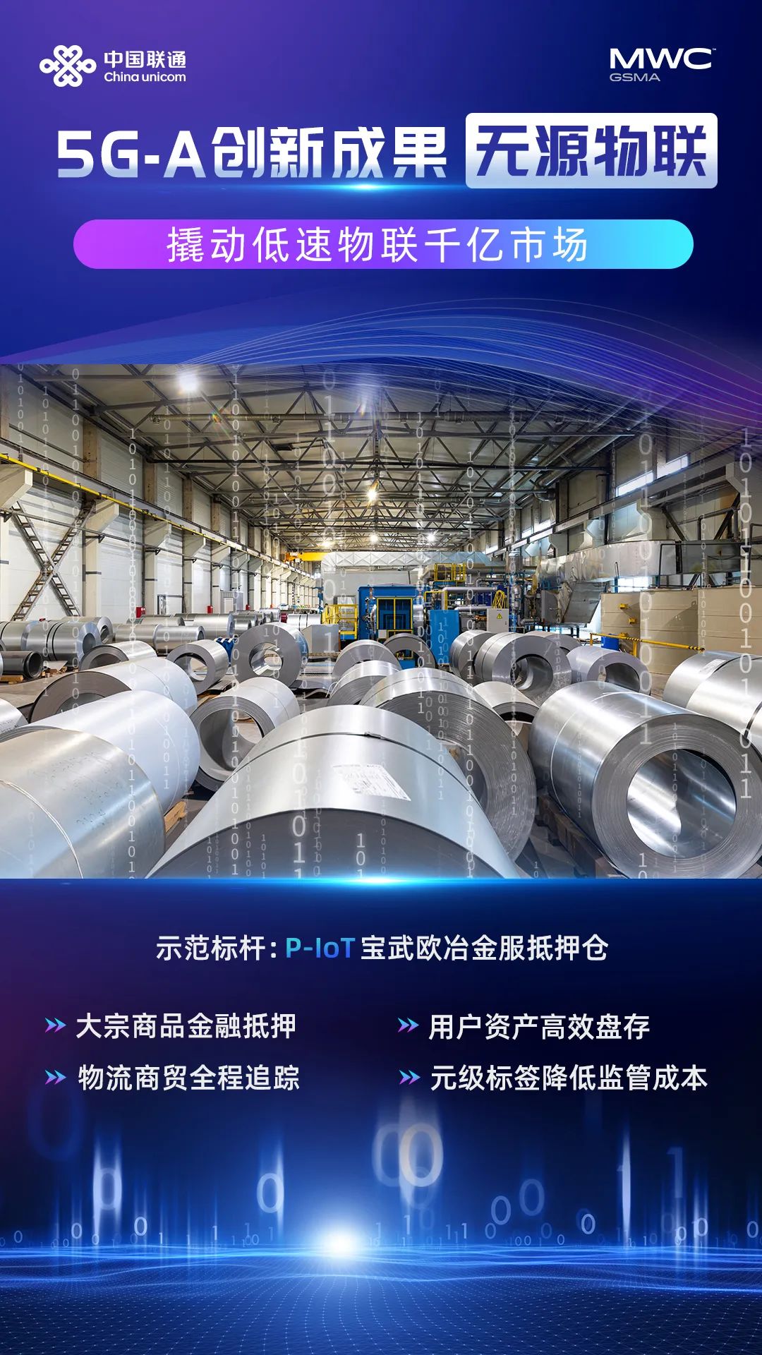 中国联通携手宝武欧冶金服在钢卷抵押仓率先实现5G-A无源物联应用试点落地。通过发挥5G-A网络优势,推出基于无源物联技术的物料数字化管理系统,利用基站精准波束赋形对标签进行供电和信息传输,实现了钢卷出入库、仓储等全流程的透明化管理,解决了质押动产保存和流动监管的难题。携手海南自贸港岛对物流仓中重点监管的免税货物贴上P-IoT标签,通过5G-A无源物联技术和海关仓储应用平台,实现端到端的物流追踪。