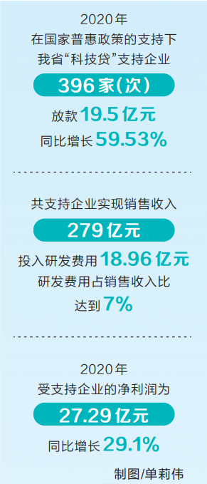 这一针对科技型中小企业“轻资产”特点量身打造的金融服务产品,一经推出就迅速发挥实效。2020年,在国家普惠政策的支持下,我省“科技贷”支持企业396家(次),放款19.5亿元,同比增长59.53%;共支持企业实现销售收入279亿元,投入研发费用18.96亿元,研发费用占销售收入比达到7%;2020年受支持企业的净利润为27.29亿元,同比增长29.1%。