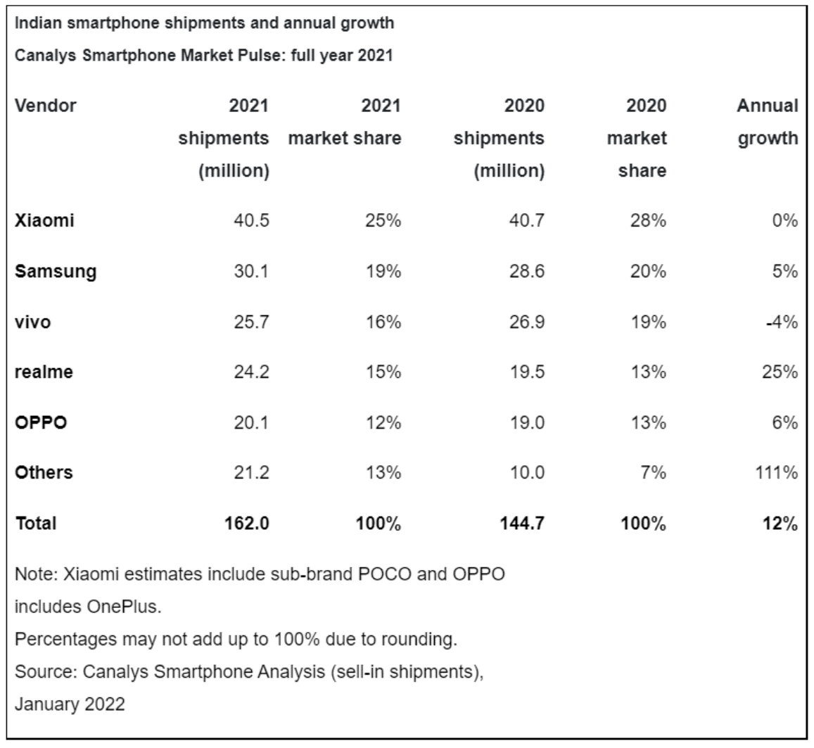 调研机构 Canalys 公布了 2021 年印度市场手机销量排行榜,小米位列第一,三星第二,vivo、realme、OPPO 分列其后。