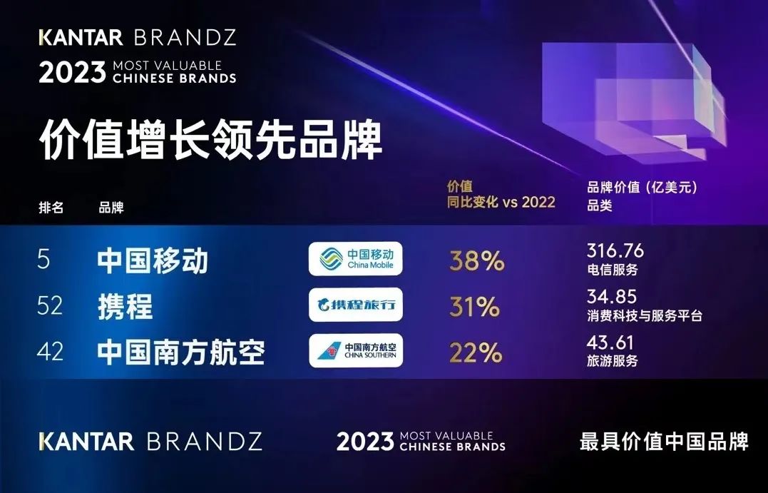 2023年9月8日,国际权威品牌数据与分析机构凯度集团正式发布2023年BrandZ最具价值中国品牌百强榜单,中国移动排名由第11位跃升至第5位,位列央企品牌第1位。值得一提的是,中国移动品牌价值同比大幅提升38%,摘得榜内价值增长最快品牌的桂冠,这也是中国移动自2019年后再次回归中国前5强。