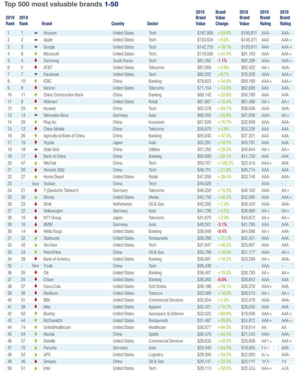 在这份报告中,中国品牌中排名最高的是华为,其排名为第12名,而微信紧随其后是全球第20名,而腾讯(QQ)、淘宝和天猫分列21、23和35名。
