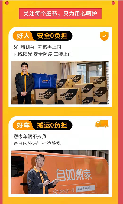 自如搬家之三重保障:保障一:好人,安全0负担:自如搬家师傅经过8门培训,4门考核之后再上岗,专业能力强,精通搬家业务,同时,搬家人员阳光礼貌,安全防疫,工装上门;保障二:好车,搬运0负担:自如搬家车辆不拉货,每日内外清洁杜绝脏乱,全面保障租客物品的清洁干净整齐;保障三:好服务,心情0负担:北京自如支持先搬后付,租客若是不满,可以要求直接返工,同时,搬家过程中明码标价,没有任何隐藏收费,让租客完全放心。