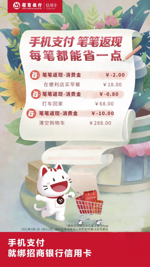 “笔笔都能返现、笔笔都能省,手机支付就选招行信用卡。”招行信用卡相关人士表示,这样的活动还将持续进行,回馈更多用户。
