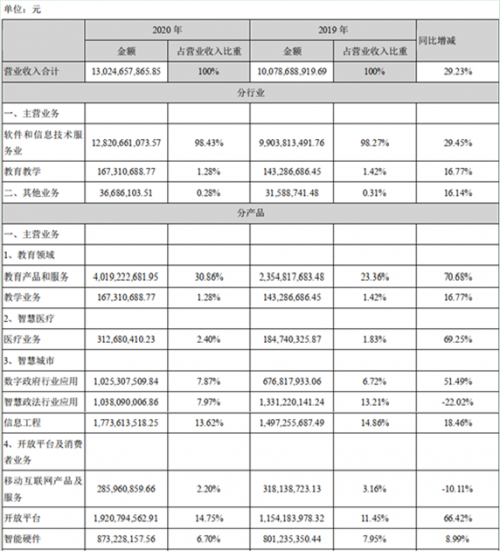 其细分业务营收主要由教育、智慧医疗、智慧城市、开放平台及消费者业务、汽车领域、智能服务等构成。其中智慧教业务营收育40.19亿元,同比增长70.68%,占营业收入比重30.86%;智慧医疗营收同比增长69.25%。