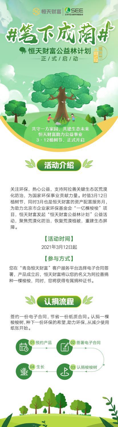 以点滴凝聚力量,从减少纸张合同做起。参与公益林计划的客户,在完成每一笔线上签署认购产品合同之后,恒天财富将向SEE基金会捐种一棵梭梭树,本期上限5万棵,客户也将拥有一棵专属编号梭梭树以及一份线上认捐回执证书。除此之外,认捐客户还将有机会参加恒天财富组织的阿拉善SEE公益治沙示范基地探访活动,考察和体验SEE基金会“一亿棵梭梭”项目。