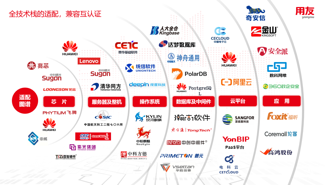 用友多年以来,持续推动国产化及信创产业发展。用友是“中国电子工业标准化技术协会信息技术应用创新工作委员会”(简称“信创工委会”)成员单位、WG22ERP与财务软件工作组组长单位,WG5云计算、WG11中间件、WG23IT咨询工作组成员单位。由于在信创服务领域的突出贡献,用友获得行业认可,获得“2019-2020年度最佳信创服务奖 ”。同时,在产品适配方面,用友NC Cloud已获得CEC安全可靠软硬件联合攻关基地PK兼容认证、 华为栈技术认证等,为国有企业提供面向全行业、覆盖多业务领域,自主可控、安全可靠的数智化产品与服务,助力国有企业数智化安全、有效落地!