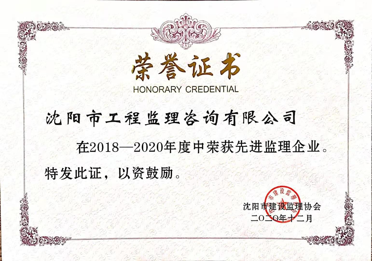 近两年沈阳市先进监理企业证书