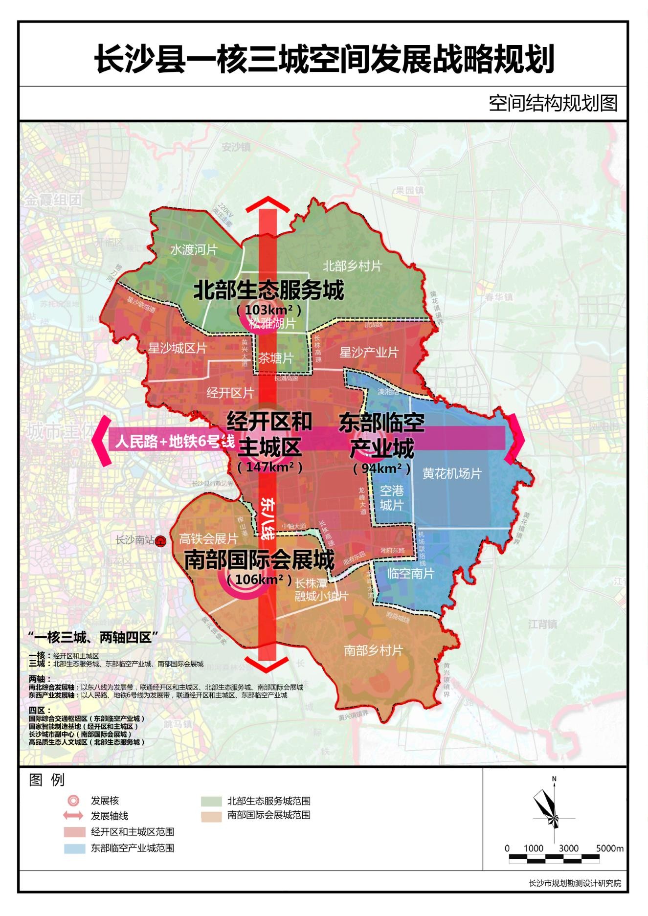 为加快从县域经济示范向大都市区经济示范区的发展,长沙县规划构建“一核三城,两轴四区”的整体发展格局。其中,“一核”即长沙经开区和星沙主城区,“三城”即东部临空产业城、南部会议会展城、北部生态服务城。