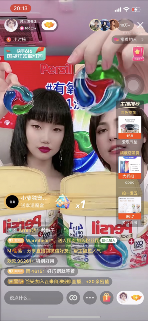 在《痒》、《HIGH》歌、《无价之姐》的背景音乐气氛拱托下,高潮来临,“乘风破浪的姐姐”黄龄惊喜现身时大漂亮直播间。二人不时劲歌热舞,气氛火热,联手推荐“洗衣液届的爱马仕”——德国汉高Persil。时大漂亮专业介绍的同时,现场做了小型洗衣实验,洗衣凝珠#有氧小飞碟#上架即被抢购,最终销售4.6万单。