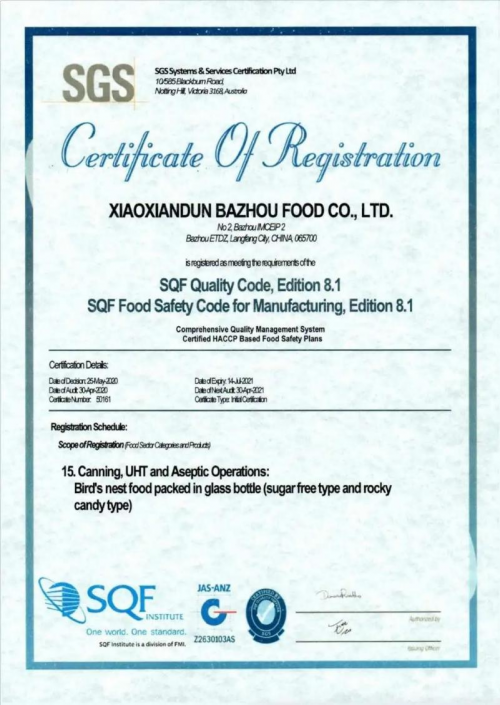 以SQF认证为例,据SGS认证专家郝磊介绍,它是全球食品行业安全与质量体系的先进标准,是覆盖从农场到餐桌全供应链的认证。小仙炖通过SQF认证,彰显了企业的品质匠心。