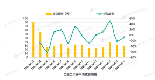 58同城、安居客《2021年4月全国二手房市场报告》数据指出,在成交周期上,4月全国二手房成交周期约为30天,环比下滑8%,且成交周期连续两个月出现缩短。而从各区域来看,中西部的平均成交周期在45天,较其他大区多10天左右,但是从环比情况来看,相较3月份都出现不同程度的下滑。