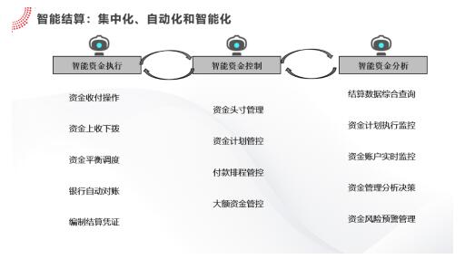智能结算包括智能资金执行、智能资金控制和智能资金分析。其中智能资金执行包括:资金收付操作、资金上收下拨、资金平衡调度、银行自动对账和编制结算凭证等;智能资金控制包括:资金头寸管理、资金计划管控、付款排程管控和大额资金监控等;智能资金分析包括:结算数据综合查询、资金计划执行监控、资金账户实时监控、资金管理分析决策和资金风险预警管理等。智能结算典型应用场景包括:自动结算、自动对账、智能化资金决策支持和智能化资金风险预警。