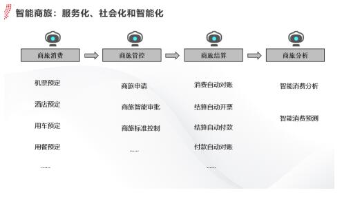 智能商旅包括:为全体员工提供商旅服务,实现商旅业务无报销、员工无垫资,提高员工满意度;企业通过搭建智能商旅平台,与社会化互联网商旅平台进行集成,实现商旅行为、费用管控、商旅资源和商旅数据的有机融合,是费用报销的一次互联网社会化升级;商旅平台实现自动比价、自动下单、自动对账、自动结账、自动分析与预测。