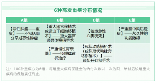 值得注意的是,常青树(少儿优选版)保险产品计划涵盖的100种重疾分为6组,其中前6种高发重疾分布在4组,最大程度提升多次赔付可能性,重疾累计最高可赔付6次。