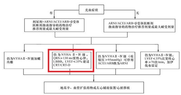 《共识》再次建议,对于符合植入指征:仍为NYHAII-IV级,QRS≥130ms窦性心律,LBBB,LVEF≤35%的患者,建议考虑心脏再同步治疗(CRT)或者心脏再同步除颤器(CRT-D)。研究证明,CRT(心脏再同步治疗)有助于改善心衰患者症状、提高生活质量、延缓病程、改善预后及降低死亡率,超过70%的心衰患者在接受CRT治疗后获益。