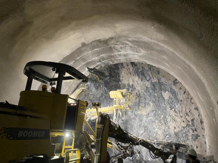 全电脑三臂凿岩台车具备全自动高效钻孔功能和钻进长度超过30米超前钻探功能,3个工作臂同时钻孔,每个工作臂可在2分钟内自动完成5m深钻孔作业,较传统施工可减少8名作业人员,并缩短每循环钻孔时间1.5小时。
