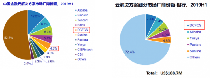 在全球权威研究机构IDC发布的2019年上半年《中国金融云解决方案市场跟踪研究》报告中,中国金融云解决方案市场规模达到4亿美元,阿里巴巴、中科软科技、腾讯、百度和融信云位居前五,总体占据34.9%的市场份额,在银行云解决方案领域,融信云以7.4%的份额占比成为银行云服务“第一人”。