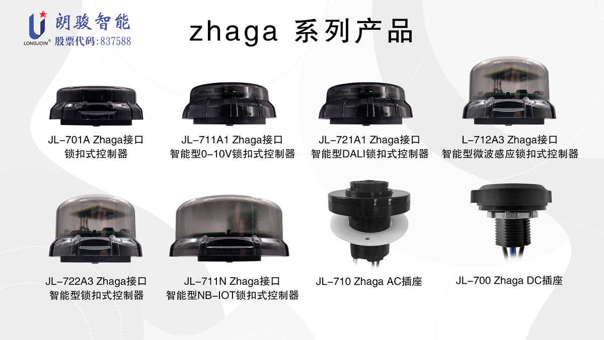 首亮光亚展的朗骏智能除了展出基于NEMA接口的光控产品:JL-245CZ旋锁式智联光控器,JL-246CG旋锁式智联光控器,JL-245CN旋锁式智联光控器,JL-471CZ内置式智联光控器,JL-208短路帽等等深受新老客户们喜爱的经典款灯具智能控制器,还带来了自主研发的硬件新品:JL-7系列Zhaga接口智能型锁扣式控制器。该系列是基于Zhaga接口的光控器系列产品——JL-7系列:JL-701A Zhaga接口锁扣式控制器,JL-711A1 Zhaga接口智能型0-10V锁扣式控制器,JL-721A1 Zhaga接口智能型DALI锁扣式控制器,JL-712A3 Zhaga接口智能型微波感应锁扣式控制器,JL-722A3 Zhaga接口智能型锁扣式控制器,JL-711N Zhaga接口智能型NB-IOT锁扣式控制器,JL-710 ZhagaAC插座,JL-700 ZhagaDC插座等。