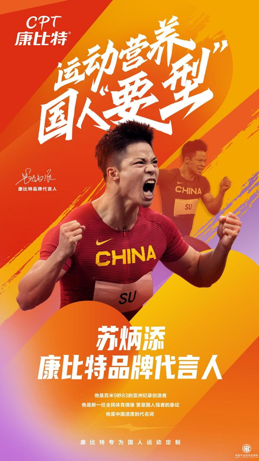 8月23日,苏炳添发布了一条微博:“支持全民运动,全民健身,康比特专为国人运动定制。【运动营养 国人要型】,我型动了,你呢?”正式官宣代言运动营养品牌【康比特】。
