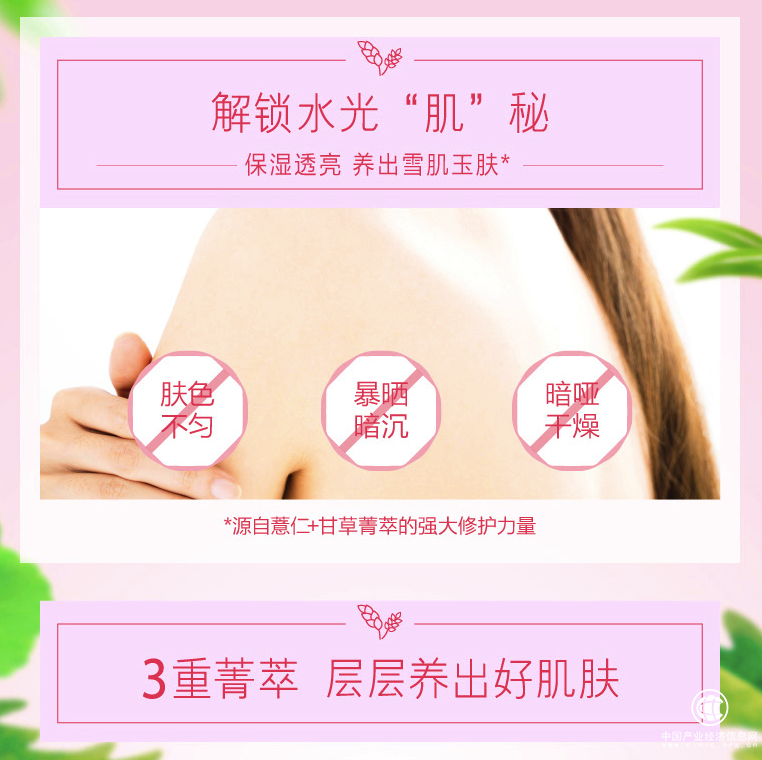 同时薏仁提取物富含蛋白质、多种氨基酸、矿物质、B族维生素、薏苡油、薏苡素等,这些化合物可促进人体新陈代谢,扩张血管、增强表皮细胞活力。薏仁提取物可用于保持人体皮肤光泽细腻,这些功能为薏仁在化妆品行业的应用提供了依据。