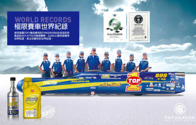 2010年,洛基·罗宾逊驾驶极速赛车Ack Attack以605.697公里/小时的速度第三次刷新了吉尼斯世界纪录,正是TOP1突破润滑油为其保驾护航。迄今为止,TOP1突破已拥有了三项“硬核”世界纪录——世界最快陆地极速赛车纪录、耐久世界纪录、最快卡车世界纪录。