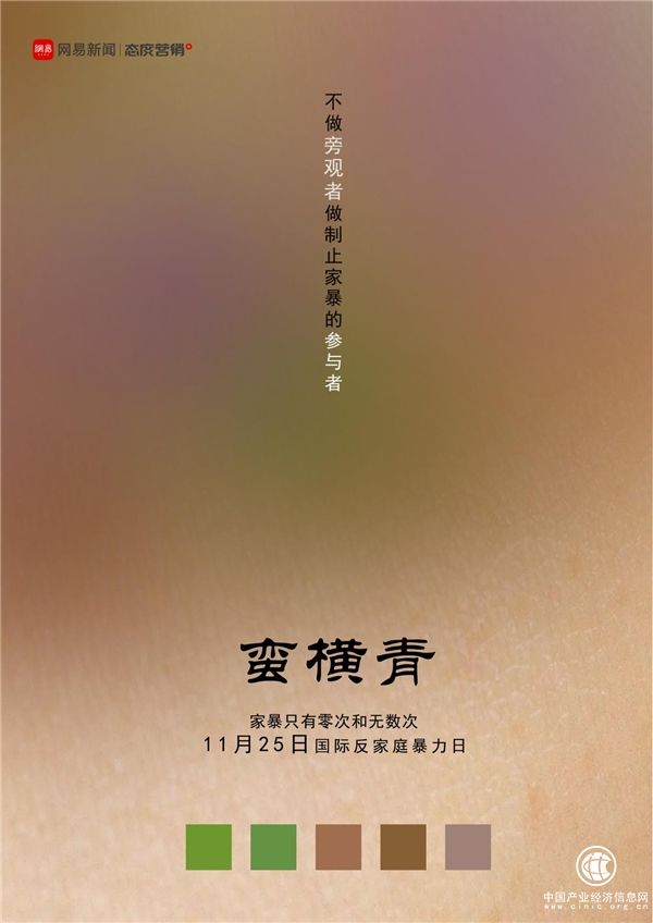 创意思想:被家暴者身上总是有不同程度的瘀伤,运用色卡的形式,通过不同色彩的叠加,制造出被家暴后的瘀伤,引起人们对于家暴的关注,不做家暴的旁观者。