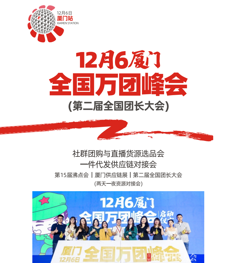 厦门是沸点的福地,自2019年开始,每年都在厦门举办一场行业大会,今年定于12月6-7日召开。厦门周边货源方聚集,有很多的食品企业、卫品企业、服装鞋包、冻品海产品等丰富的货源。并且交通便利,方便平台渠道方、团长来选品。当地也有一批优秀的社群团购平台和团长可以对接资源。