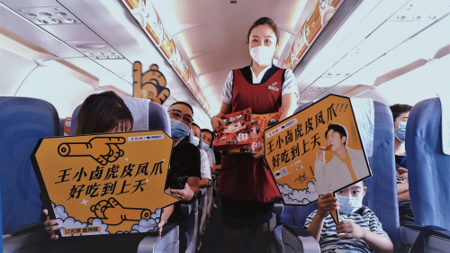 你以为“飞鸡上天”只有一段广告?那你就too young too naive了,王小卤还真定制了一架自己的鸡爪主题包机,成功将虎皮凤爪送到了天上去!如果你恰巧买到了这架飞机的机票,在取票区就先有一波鸡爪样品诱惑你,接着临上飞机发现自己上的是王小卤专机,连机舱内的口播语音都有王小卤的沙雕广告词,正当你一脸不屑,心说有本事整点实在的呢?飞机上还真就给大家发了王小卤联合同程的零食礼包!在枯燥乏味的飞行时光里,将一款美味的肉类零食送到客户手上,无疑会得到消费者的青睐。