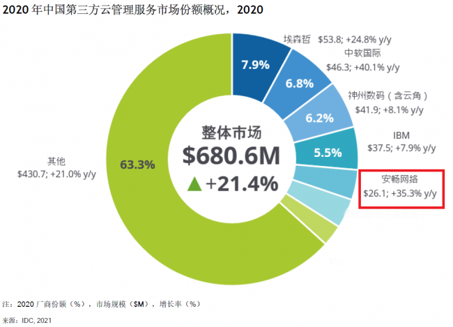 之前,IDC发布了2020年中国第三方云管理服务市场份额报告,安畅排名进一步靠前,位列中国市场份额第5位,是报告中唯一一家完全专注于Cloud MSP的新型科技公司,也是唯一一家尚未公开上市的公司。