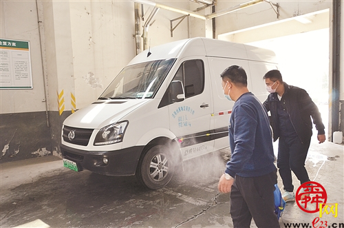 配送完当天的卷烟回到单位,工作人员对配送车辆内外进行消毒。