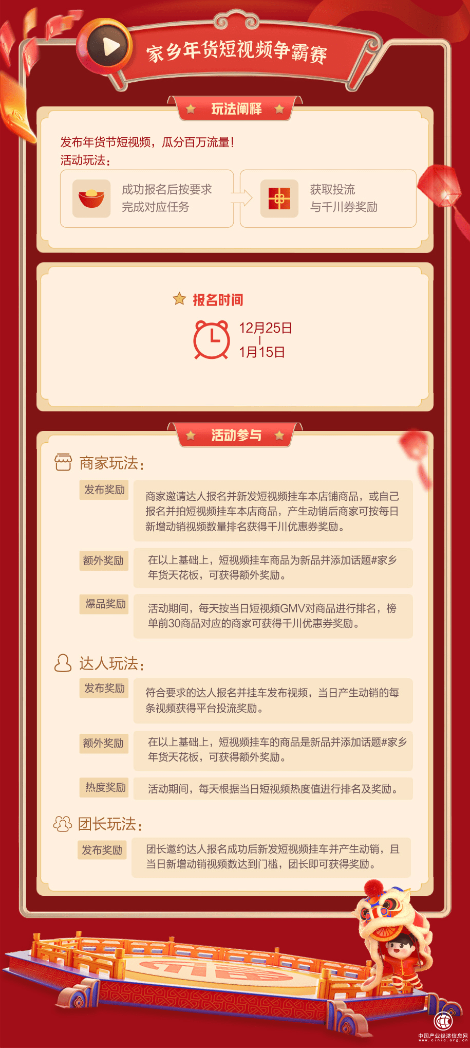 抖音好物年货节将于2022年1月1日正式开始,并于1月16日结束。活动期间,抖音好物年货节还将推出好物直播间、家乡年货短视频争霸赛、全民任务赛、巅峰任务赛等多种玩法及平台技术服务费限时返还、百亿补贴等多重运营支持政策,帮助合作伙伴快速达成销售目标。