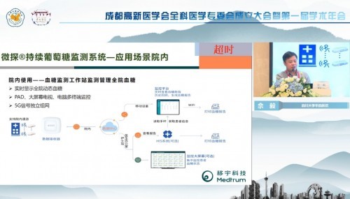 四川大学华西医院苏巧俐主任做会议主持,四川大学华西医院佘毅主任做了题为“远程动态血糖监测在社区医院的应用”的报告。佘毅主任介绍TIR(目标范围内时间)作为评估短期血糖变异性的关键指标之一,能更好的反映相同HbA1c时低血糖的发生状况和血糖变异程度,且TIR与HbA1c之间存在良好的线性关系,所以逐渐成为医护工作者更为关心的指标。移宇科技的持续葡萄糖监测系统(CGMS)因可提供包括TIR在内的多个重要指标和报告,且产品优势突出、全院血糖管理系统简化血糖管理的流程同时,可以帮助医生多方位掌握患者葡萄糖变化水平,检测结果准确,为医患带来更多的获益,优化了血糖监测管理。